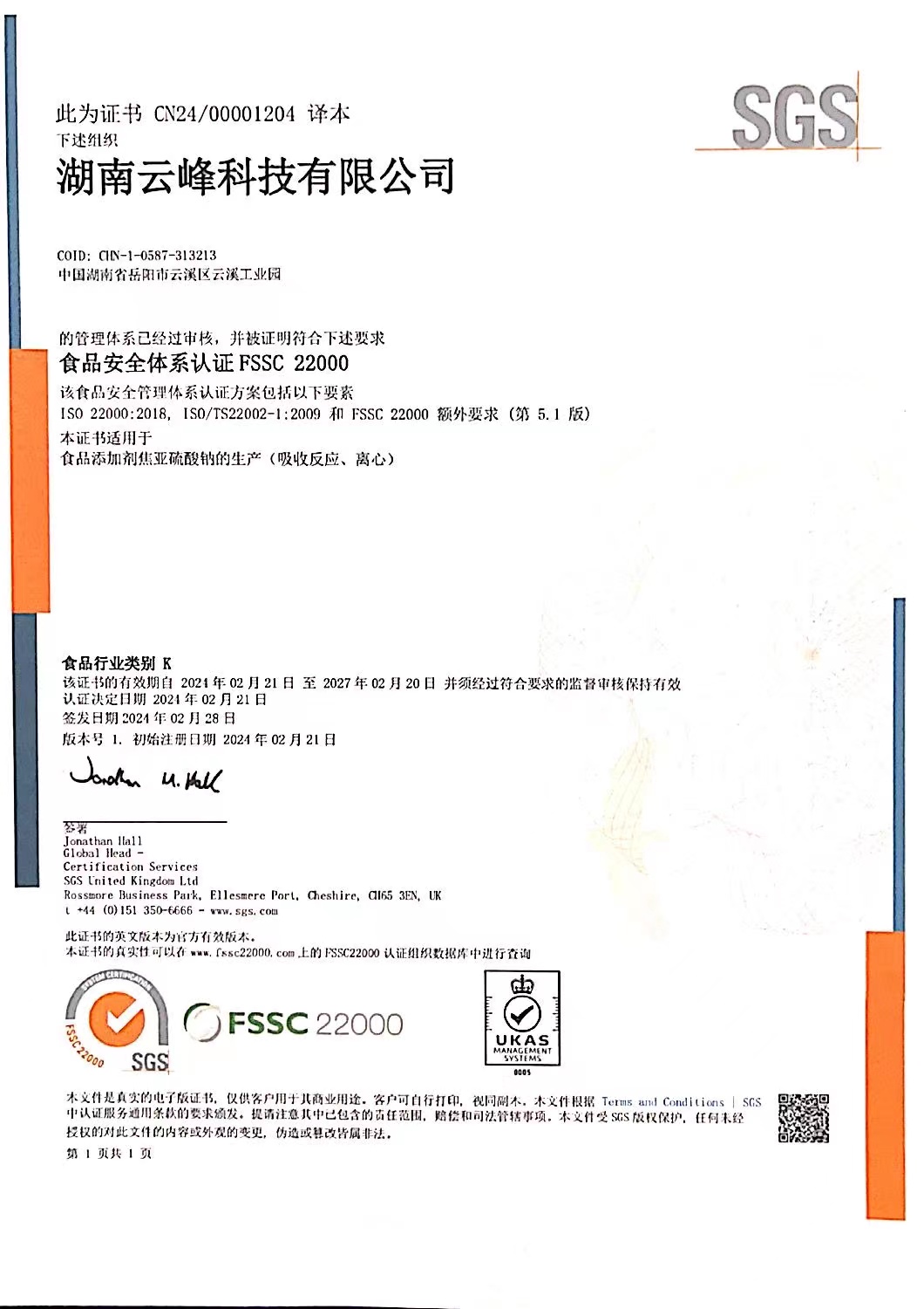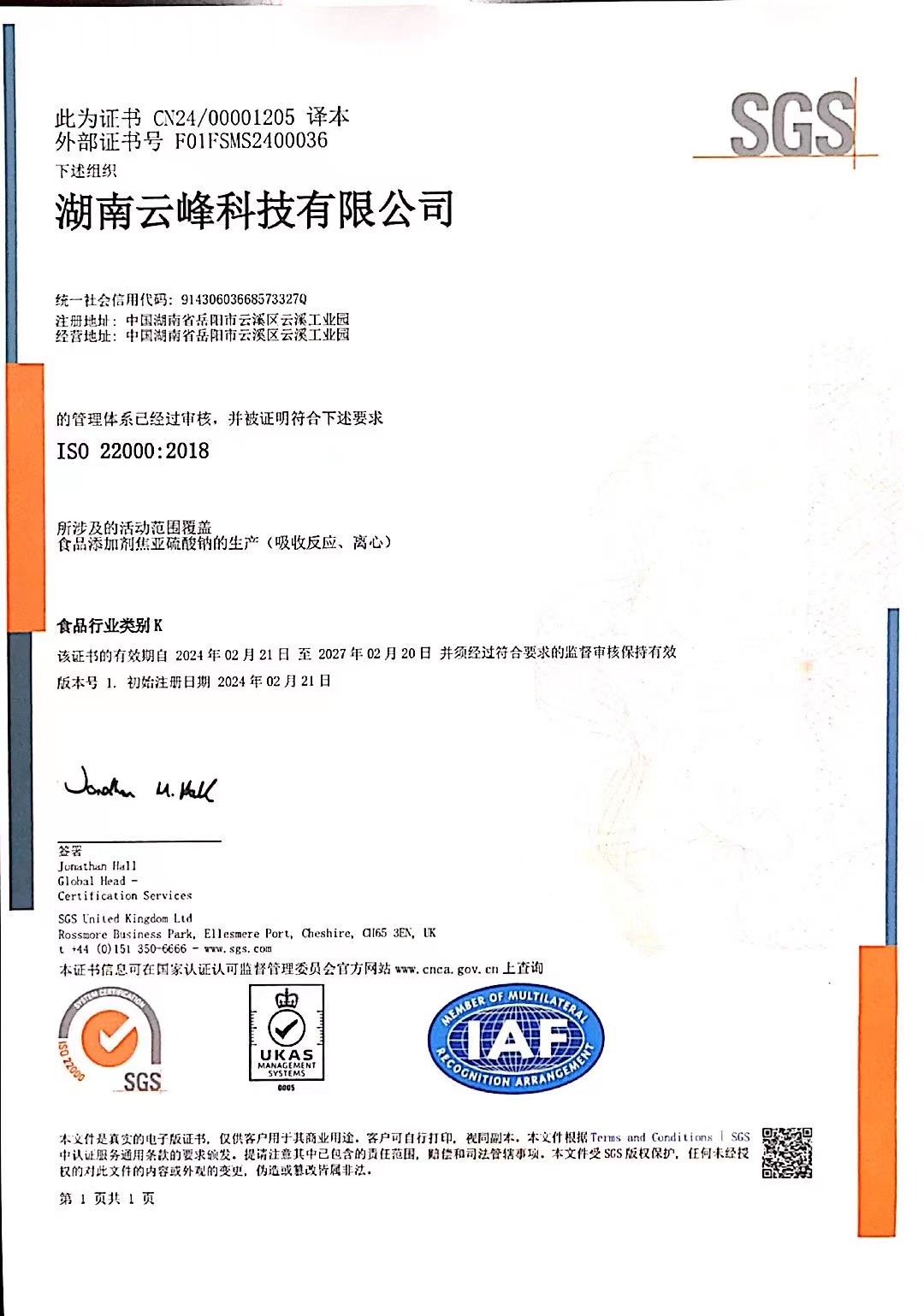 湖南云峰科技有限公司(以下簡稱云峰科技),是由長沙湘岳化工責任有限公司全額投資以生產焦亞硫酸鈉、亞硫酸鈉等亞硫酸鹽為主營業務的高科技企業,具有六十多年的生產歷史,同時也是焦亞硫酸鈉的國家標準制定參與者。在行業內具有很大的影響力?,F有職工八十余人。具有優良的經營管理團隊和成熟的生產技術隊伍。由多位在化學、化工行業擁有豐富工作經驗的工程師及技術員團隊組建而成,致力于亞硫酸鹽產品的研發、生產和銷售。2020年公司對生產設備、安環設施及工業技術等進行了大規模的升級改造,使焦亞硫酸鈉和亞硫酸鈉的生產工藝更加先進,技術更成熟,產品質量更優良。無論在生產工藝、設備、產品質量、清潔生產、節能環保和員工素質方面,均處于行業領先地位。公司的主導產品“云峰”牌焦亞硫酸鈉,歷史悠久,深受國內外客戶信賴,產品遠銷東南亞、歐美、非洲、南美洲等20多個國家和地區,產品供不應求。